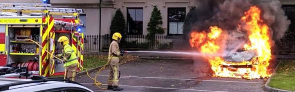 Never use water on an engine fire, as it can short out the wiring and spread any burning fuel. If it is safe to do so, use a dry powder or foam fire extinguisher (BS EN3). If the fire is in the engine compartment, do not open the bonnet – instead, aim the extinguisher through the radiator grille or under the lid.