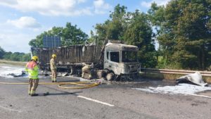 Description: We were called to the M4 eastbound between J15 Swindon and J14 Hungerford this afternoon for a lorry fire. Four fire engines were sent to the scene, together with a water carrier. The lorry was fully involved in fire and there were several explosions from gas cylinders on board. There were no injuries.
