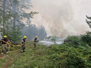 12.30pm update: We currently have 4 appliances, two Unimog’s, a water carrier, a high water volume pump, welfare unit, command support vehicle along with a heavy off-road appliance and three small 4×4 appliances in attendance. Crews are dealing with hotspots and creating fire breaks.