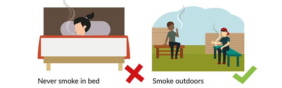 - Take extra care if you smoke when you’re tired, taking prescription drugs or if you’ve been drinking. You might fall asleep and set your bed, sofa or clothing on fire.